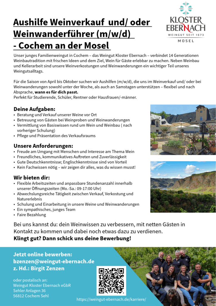 Wir würden uns freuen für die nächste Saison eine/n nette/n Kollegen/ Kollegin für den Weinverkauf zu finden. Die Stelle kann sehr flexibel gestaltet werden, sowohl die Arbeitszeiten, als auch die Aufgabengebiete lassen sich frei gestalten. Wir suchen sowohl jemanden für den Weinverkauf vor Ort als auch für geführte Weinwanderungen durch unsere Weinberge.